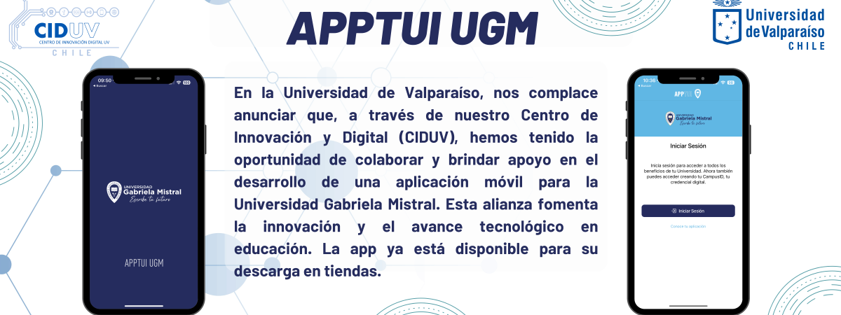 En la Universidad de Valparaíso, nos complace anunciar que, a través de nuestro Centro de Innovación Digital (CIDUV), hemos colaborado en el desarrollo de una aplicación móvil para la Universidad Gabriela Mistral.