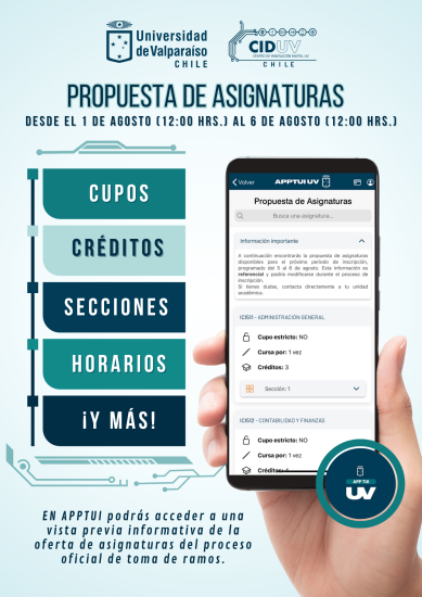 Querida comunidad universitaria, te informamos que desde el viernes 1 de agosto a las 12:00 hrs. hasta el miércoles 6 a las 12:00 hrs., estará habilitada en AppTUI UV Digital la funcionalidad “Propuesta de Asignaturas”.