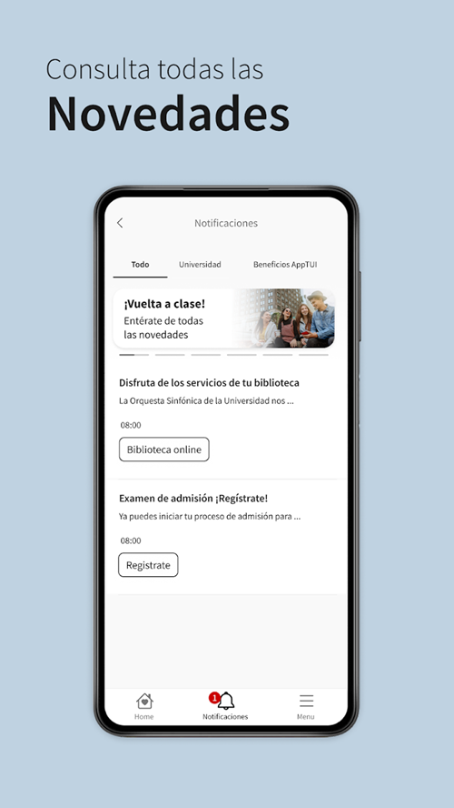 Esta primera versión contempla inicio de sesión mediante cuenta académica institucional, credencial digital, notificaciones push, sección de noticias y novedades, banner informativo, beneficios Santander (como becas y descuentos), código QR dinámico para control de acceso, widget tutorial y accesos directos a sitios institucionales.